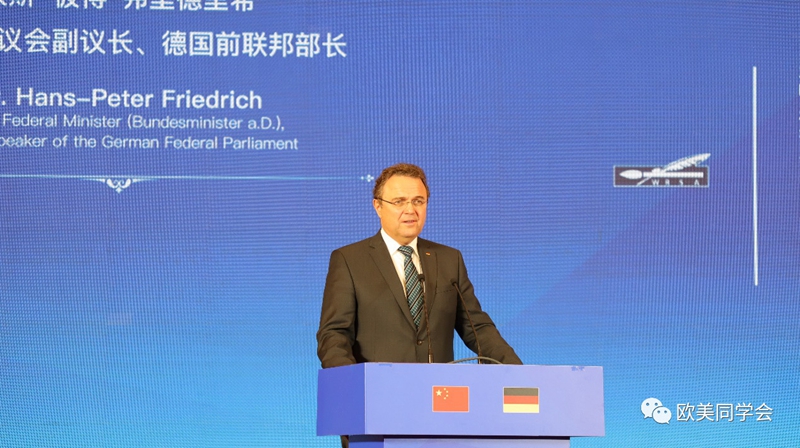 刘利民主持 汉斯-彼得·弗里德里希表示,德中双方都积极推动合作发展,对双方合作取得的成功表示祝贺。通过这次论坛,中德相关领域人士齐聚一堂,这表明双方对于合作的重视和高度认同。德中双方搭建政府、企业、科技的合作桥梁,打下了稳固坚实的基础。从与中国的合作中,德国也学到了很多。汉斯-彼得·弗里德里希对欧美同学会促成双方多层次合作高度赞赏,表示今后将不断深化在环境保护、人工智能、智能制造等多领域的合作,在“一带一路”倡议下发挥全球化的优势和长处,增进全人类的福祉。