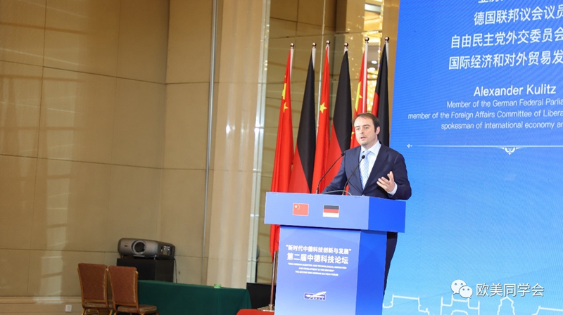 闫傲霜致辞 亚历山大·库利茨在致辞中祝贺欧美同学会举办本届论坛,他指出,欧美同学会是知识和智慧的集大成者,在对外科学、技术交流交往上的作用尤其明显。过去一年里,中德合作进一步加强,为中德两国科技、人文交流贡献了力量,希望在此框架下为未来繁荣搭建更好的友谊桥梁。